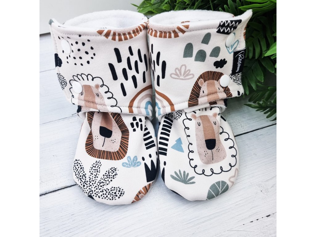 Propracovaný střih zajistí Vašemu miminku pohodlí a teploučko. Capáčky šijeme dostatečně široké pro co největší pohodlí Vašeho zlatíčka, zároveň je okolo kotníčku gumička, aby se botička nevyzula. Capáčky mají praktické zapínání na 2 patentky. Celý capáček je podšitý měkoučkým fleesem, který zajistí dostatečnou tepelnou pohodu Vašemu miminku. Podrážka je z protiskluzného materiálu, takže krůčky Vašeho kulíška budou bezpečnější.