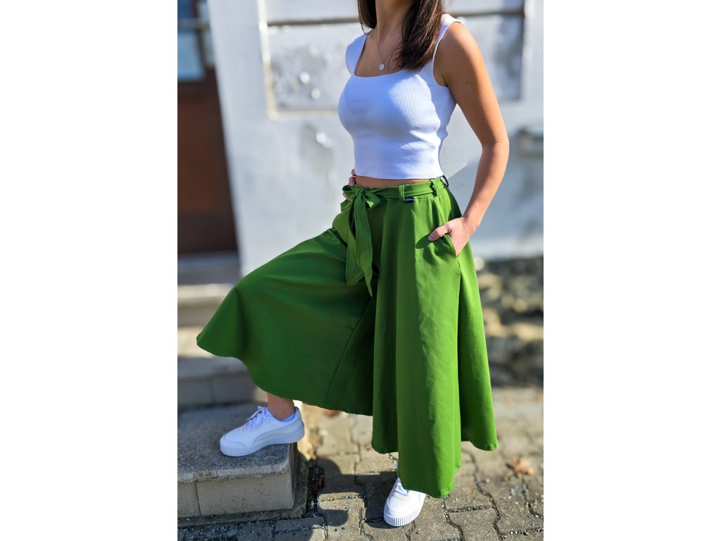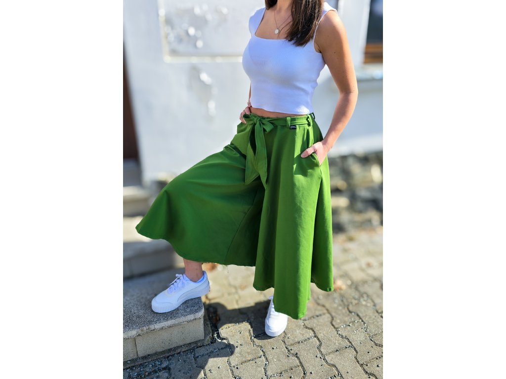 Kalhotová sukně má v pase pružnou gumu. Po stranách jsou skryté, praktické kapsy.