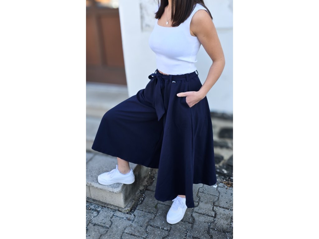 Kalhotová sukně má v pase pružnou gumu. Po stranách jsou skryté, praktické kapsy.