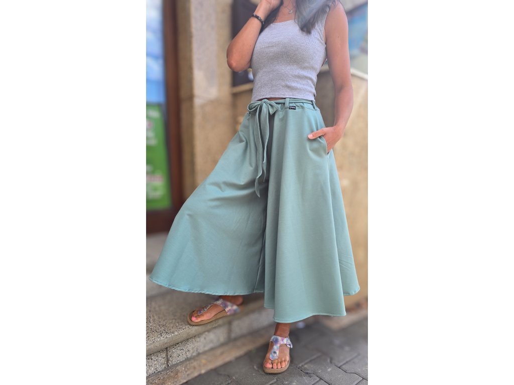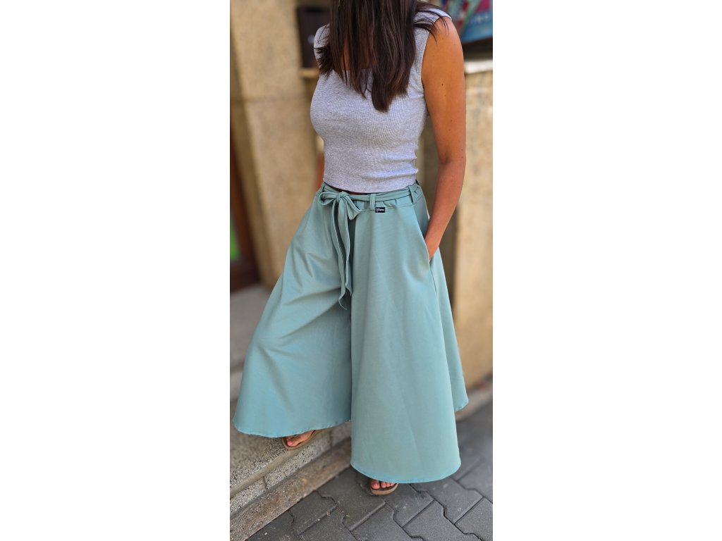 Kalhotová sukně má v pase pružnou gumu. Po stranách jsou skryté, praktické kapsy.