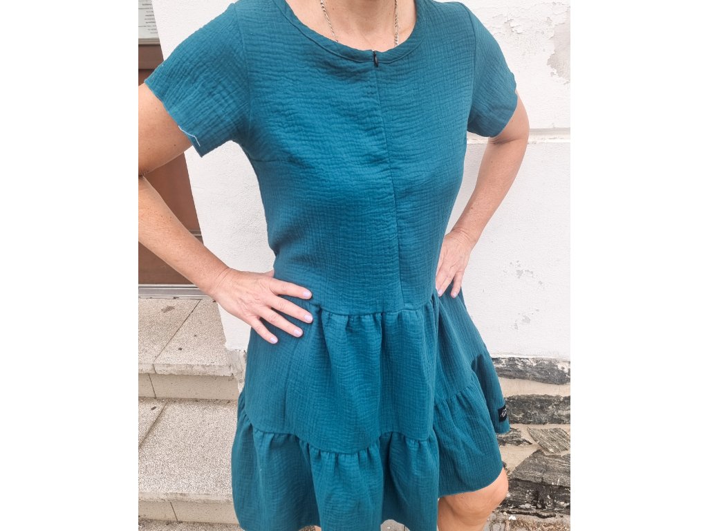 Mušelín je prodyšný materiál, který k nám přišel ze Středního Východu. Látka je vyráběná z mykané příze, ideální na horkého a suché období. Díky dvojité vrstvě gázoviny nejsou průsvitné. Možné nosit i k legínám jako delší tuniku. Hodí se k teniskám na procházku s kočárkem, ale i k lodičkám, třeba i na letní svatbu kamarádky.