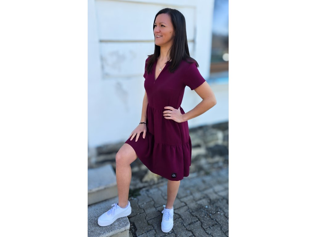 Mušelín je prodyšný materiál, který k nám přišel ze Středního Východu. Látka je vyráběná z mykané příze, ideální na horkého a suché období. Díky dvojité vrstvě gázoviny nejsou průsvitné. Možné nosit i k legínám jako delší tuniku. Hodí se k teniskám na procházku s kočárkem, ale i k lodičkám, třeba i na letní svatbu kamarádky.