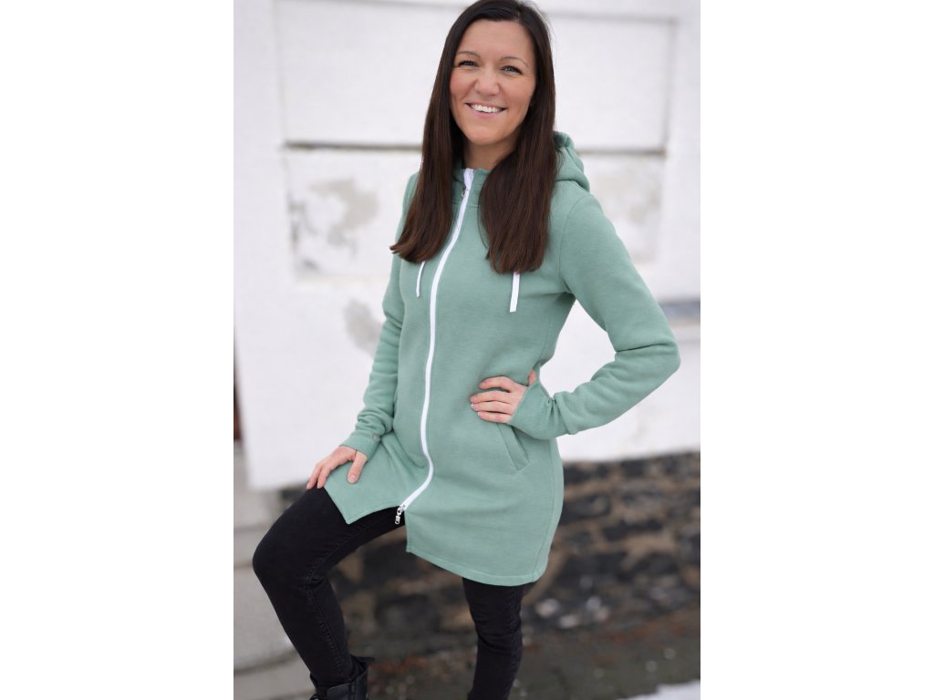 Mikinošaty mají zip po celé délce, takže je lze nosit několika způsoby – jako mikinošaty, samostatnou lehkou bundičku nebo zateplující vrstvu pod bundu či kabát. Slušivá délka nad kolena, kapuce se šňůrkami a praktické kapsy zajišťují maximální komfort při každodenním nošení.