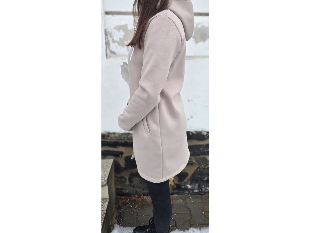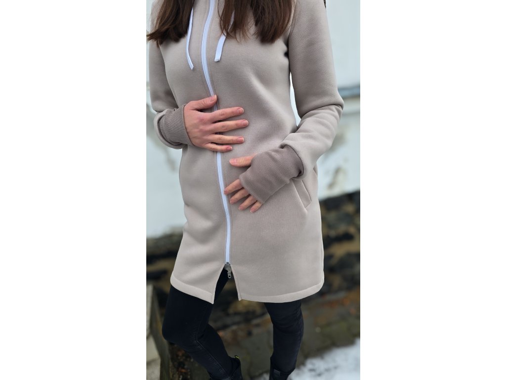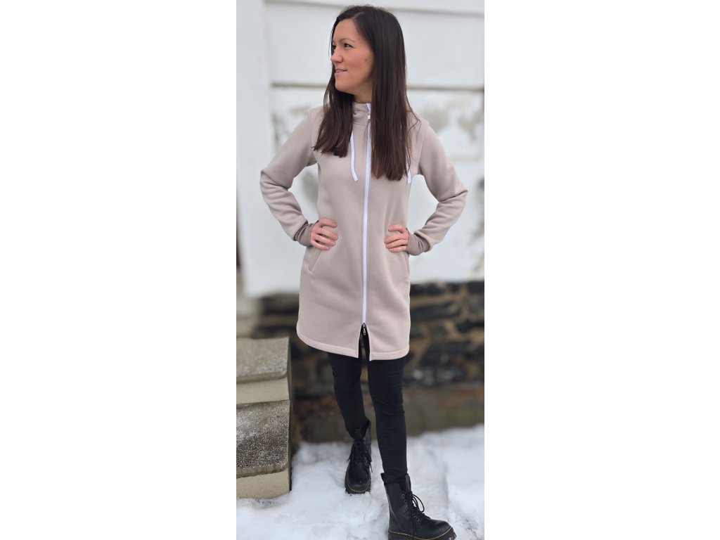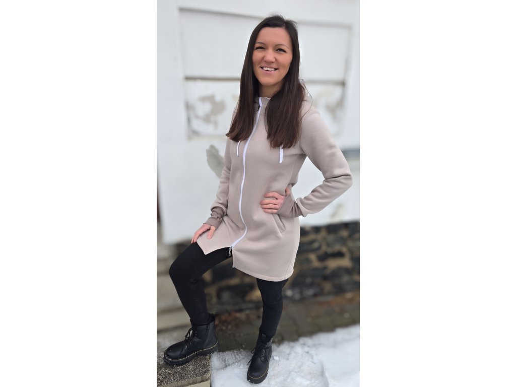 Mikinošaty mají zip po celé délce, takže je lze nosit několika způsoby – jako mikinošaty, samostatnou lehkou bundičku nebo zateplující vrstvu pod bundu či kabát. Slušivá délka nad kolena, kapuce se šňůrkami a praktické kapsy zajišťují maximální komfort při každodenním nošení.