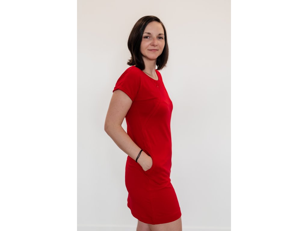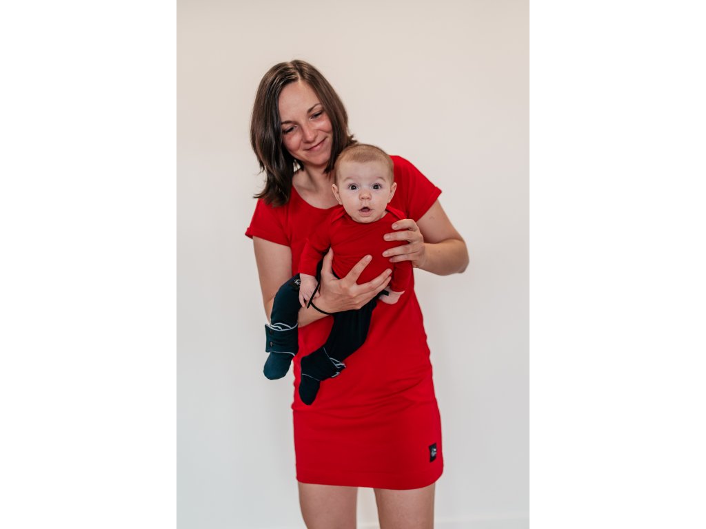Červené letní šaty se skrytými zipy na kojení