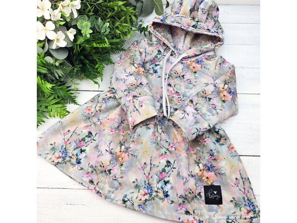 Mikina s kapucí a oušky, střižena do tvaru A. Funkční šňůrky na utažení kapucky. Střih vychází z našich oblíbených princess šatiček.