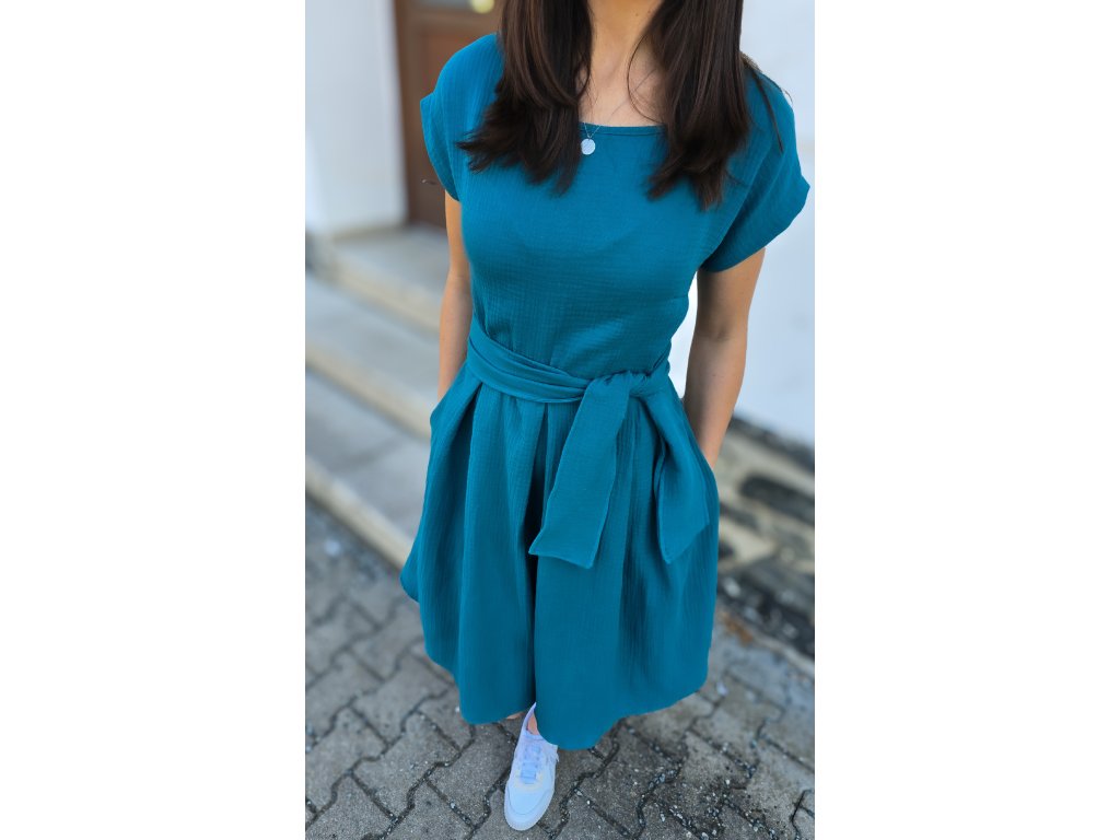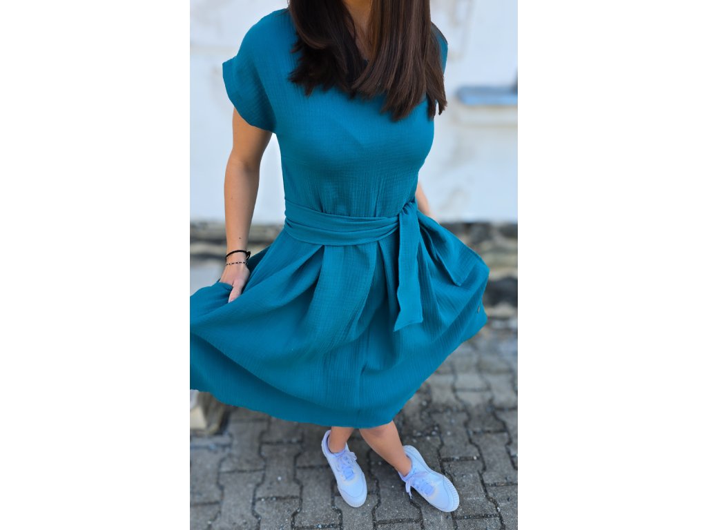 s lodičkovým výstřihem a skládanou sukní. Romantická vázací mašle kolem pasu dodávají šatům jedinečný ženský look, ve kterém si budete připadat nejkrásnější na světě. Šaty jsou navržené v romantickém stylu, hodí se tedy na významné události, večeře či pracovní schůzky, ale i maminka s kočárkem s nimi na procházce udělá parádu.