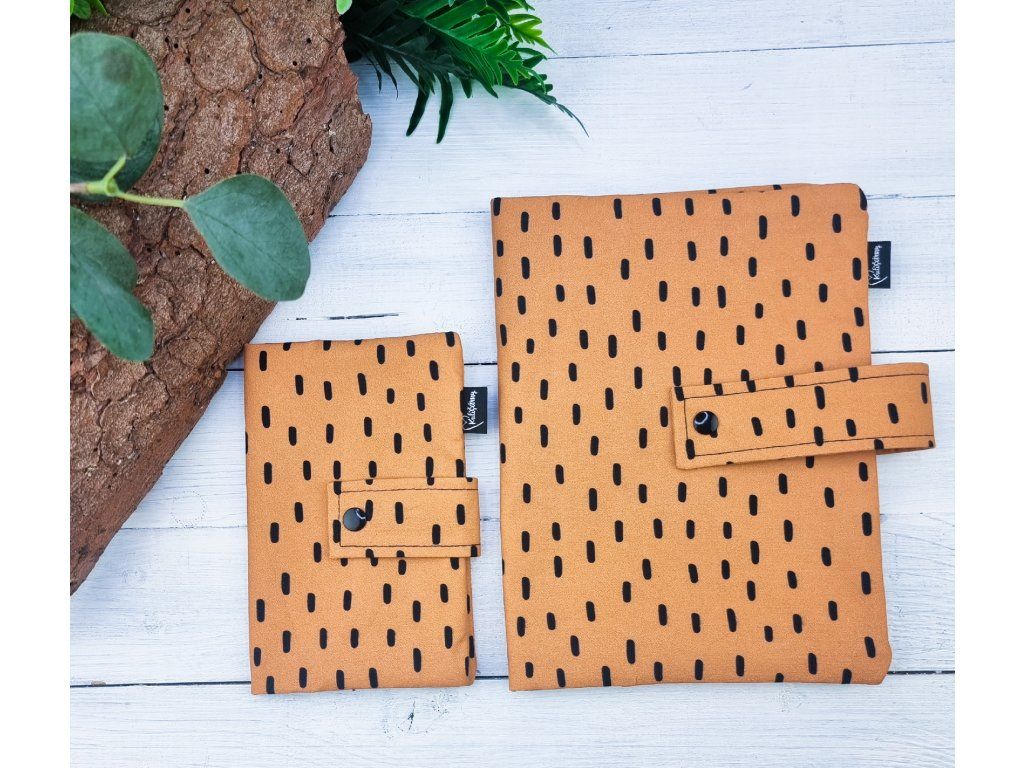 Designový plenkovník a obal na očkovací průkaz v minimalistickém tisku černých čárek na hnědooranžové