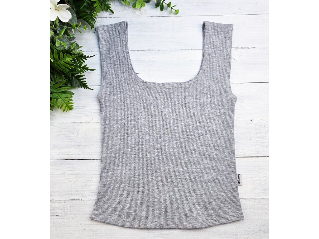 Top je šitý z kvalitního bavlněného úpletu s elastanem, který dobře drží tvar. Nošením se materiál lehce přizpůsobí postavě a po vyprání se vrací do původního stavu.