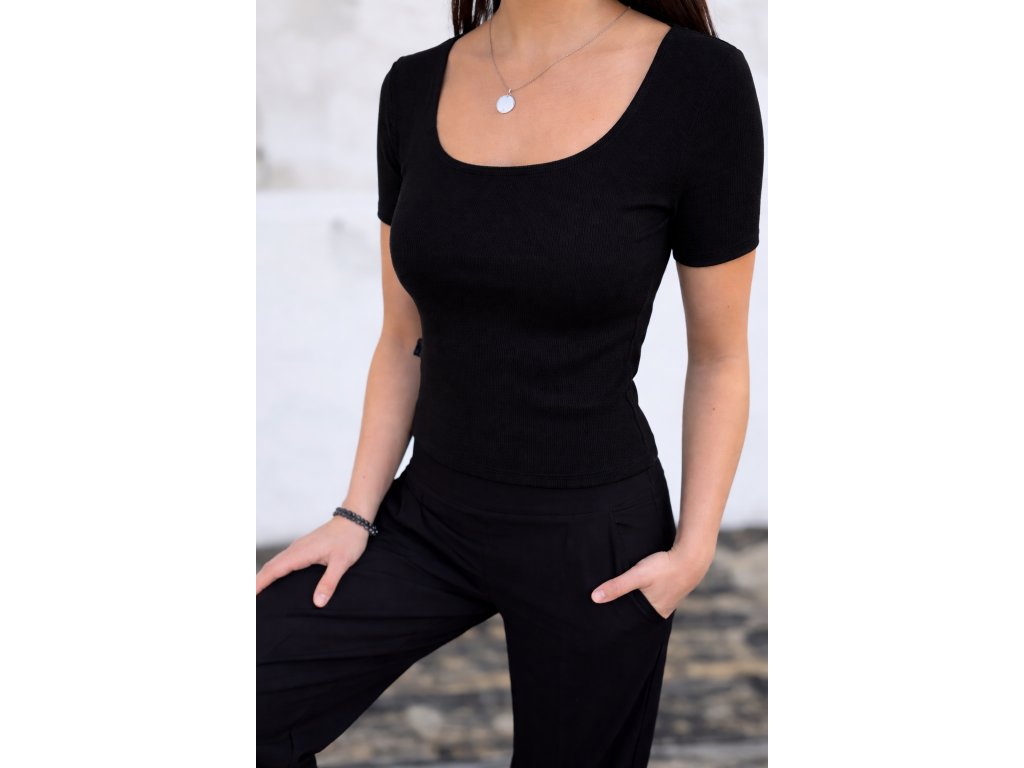 Pohodlné žebrované triko v kratším střihu, ideální ke kalhotám a sukním s vyšším pasem. Pružný RIB úplet krásně přilne k postavě a tvoří univerzální základ šatníku.