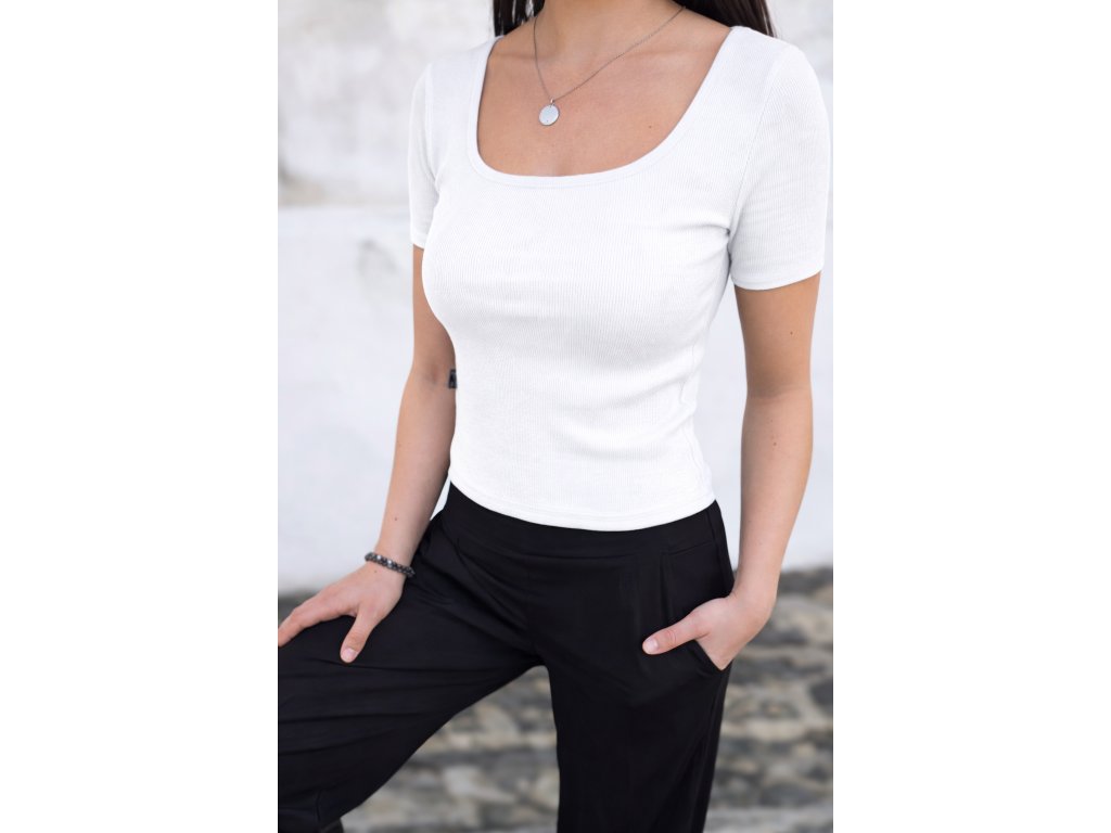 Pohodlné žebrované triko v kratším střihu, ideální ke kalhotám a sukním s vyšším pasem. Pružný RIB úplet krásně přilne k postavě a tvoří univerzální základ šatníku.