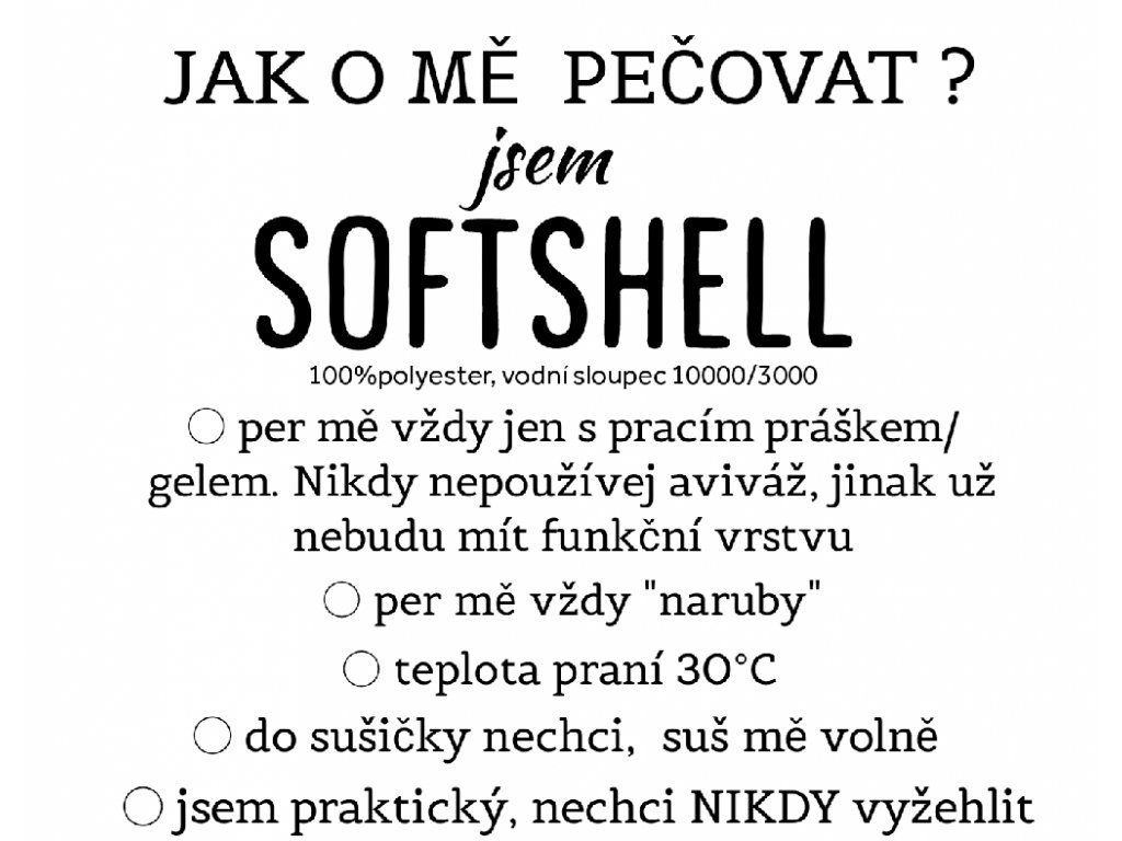 Softshell je praktická, prodyšná a nepromokavá látka. Skládá ze tří vrstev: termoaktivní látka, izolační vrstva měkký fleece, vnější nepromokavý materiál s membránou. Odolá většině klimatických podmínek.
