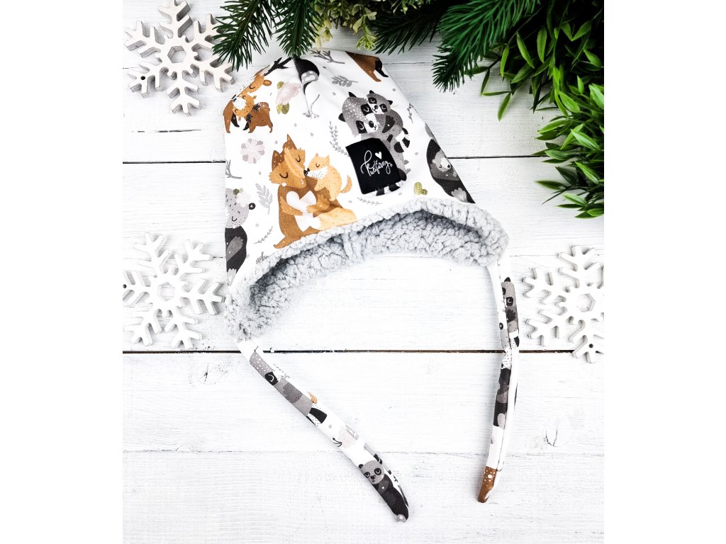 zimní ušanka s motivem zvířátek s měkkým hřejivým šedým beránkem