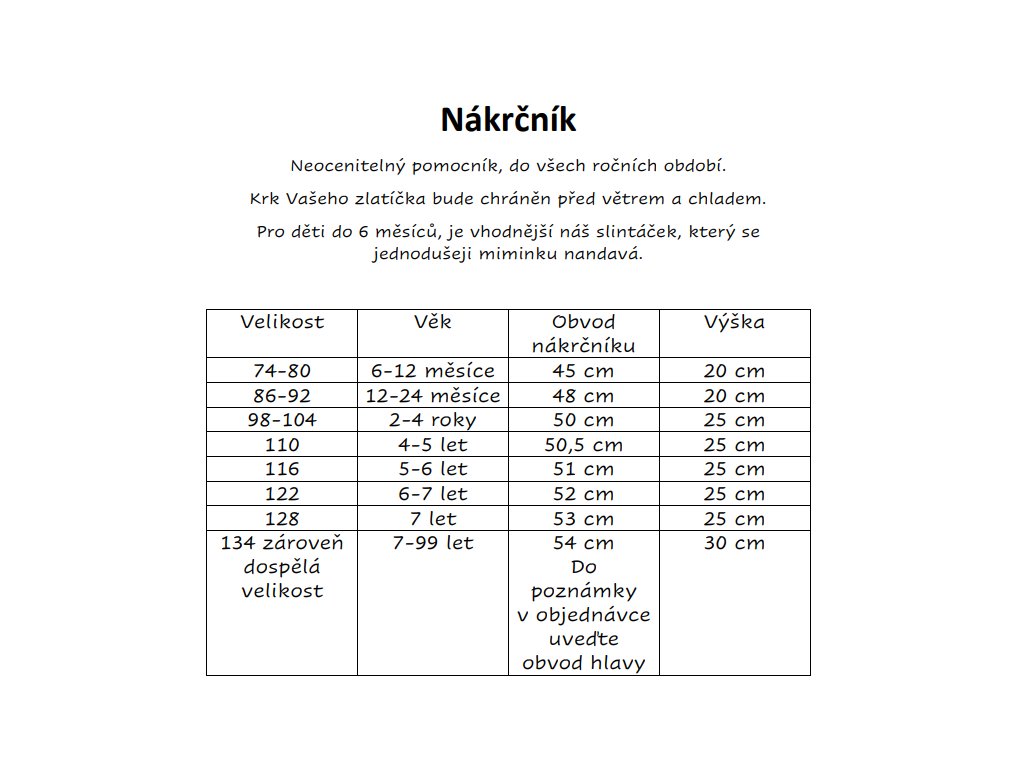 je úžasný doplněk, díky kterému už holý krk vaše zlatíčko mít nebude. Zateplená čepička pro Vašeho kulíška díky hebkému warmkeeprovému chloupku uvnitř zahřeje i toho největšího zmrzlíka při venkovních radovánkách. K nákrčníku si můžete vybrat i čepici ve stejné barvě. Pro děti do 6 měsíců, je vhodnější náš slintáček, který se jednodušeji miminku obléká.